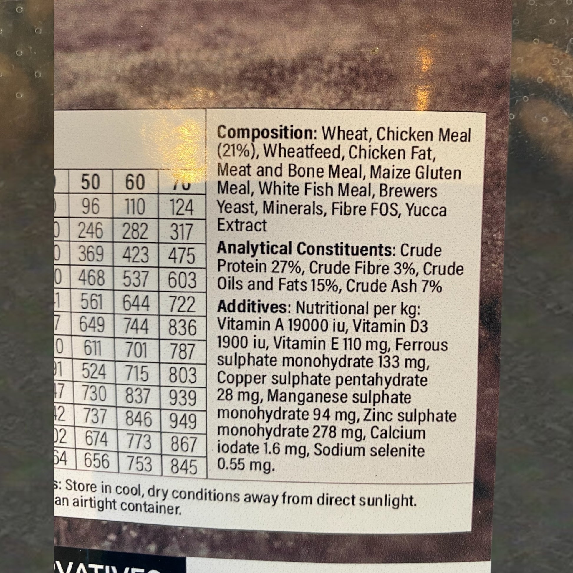 Poultry Meal (26%), White rice, Whole Maize, Poultry Oil, Maize Gluten Meal, Sugar Beet Pellets, Fish Meal, Whole Linseed, Brewers Yeast, Fructo-oligosaccharides (FOS) Extract of Yucca Schidigera.